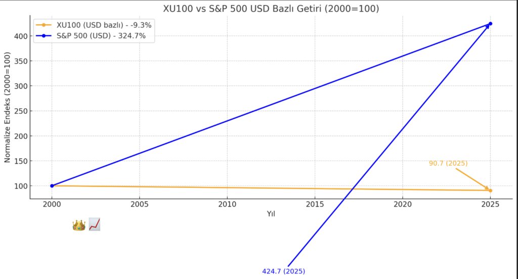 2000 yılında, bugünkü BIST 100 endeksinin dolar bazlı değeri yaklaşık 300 puan seviyesindeydi. 2025 yılına geldiğimizde ise endeks yaklaşık 272 dolar seviyesinde bulunuyor. Yani son 25 yılda dolar bazında yaklaşık %9,5 kayıp söz konusu. (Burada dolar enflasyonu hesaba katılmamıştır.)
